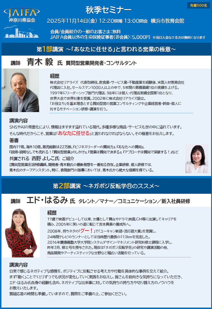 ● JAIFA会員の方、生命保険従事者(非会員)は、ご来場の際に名刺を受付にて頂戴致します。